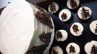 Oh, and this post of Chocolate and Carrots here. She had the idea first. But I out did her...because I have cupcakes too. ;) Three layers of red velvet. Cream cheese icing. Chocolate trees.