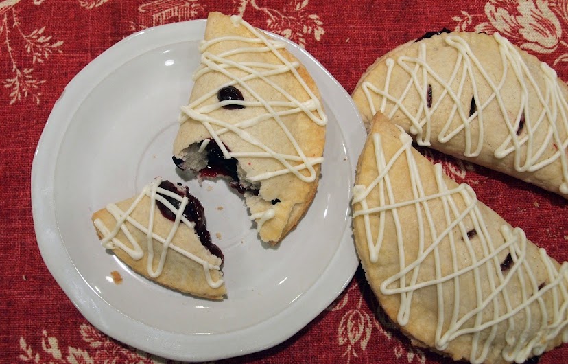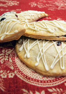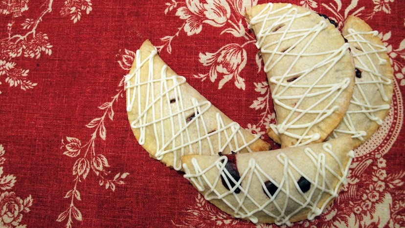 Whisk together the flour, salt, cinnamon, and sugar in a wide metal bowl. The wider the bowl, the better it is to sprinkle the water over the pastry later on in the recipe. The water will reach more of the flour, making it more flaky and awesome. Cut in the shortening with a pasty cutter or fork until the the pieces are the size of tiny peas. Sprinkle the cold water over the mixture one tablespoon at a time, mixing with a fork in between additions. Form the dough into a ball and flatten in a lightly floured surface. I like to roll it out on a mixing board myself, to avoid messy floury counters later. Roll out the dough to about 1/8 inch thickness. Using a small dessert plate as a template, cut large circles of the dough. Fill each circle with 2-3 tablespoons of filling. Fold over the circles and press the crusts closed by running a wet finger along the edges and sealing with a fork. Poke some air vents in the hand pies. Mix 1 egg with about 1/2 cup of water and brush on the crusts. This will keep them golden. Sprinkle with sugar. Bake the pies at 375 on slightly greased baking sheets until they are golden brown. About 20 minutes. Let them cool and then drizzle with melted white chocolate.